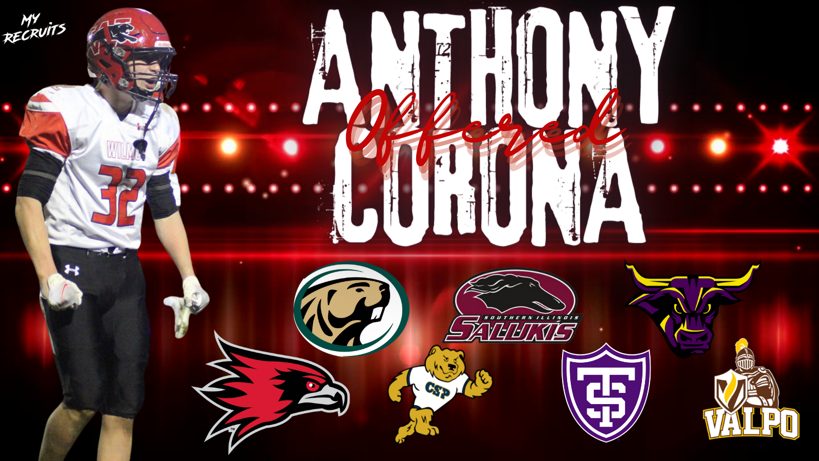 Talent will Always Shine!! That’s what everyone kept Telling Anthony Corona, the 6’2 205 LB Safety from Wilmot HS in Wisconsin. Anthony had an amazing junior season for Wilmot and his Film Definitely Jumped out at you One FCS Coach Said “Explosiveness & Quickness are Rare in Long Defensive Athletes and this guy has Both”. Corona has been working with Coach Perrone from My Recruits for slightly less than 3 Months and he adds “Anthony was very impatient when he first came on board with n0 offers but I explained to him he was too good for it to stay that way And indeed it was”. Corona planned out the camp scene and got on the road and the explosiveness and quickness that everyone’s been talking about was able to be seen live in person. Corona Attended Camps at Lindenwood and NIU amongst others and started to catch some eyes fast. Coronas First Offer Came on 5/5 from a Very Solid D-2 Concordia St Paul where coach Mike Bond said “I’m not afraid to be first!! Sometimes you need to show these guys you want them! No Excuses”.
